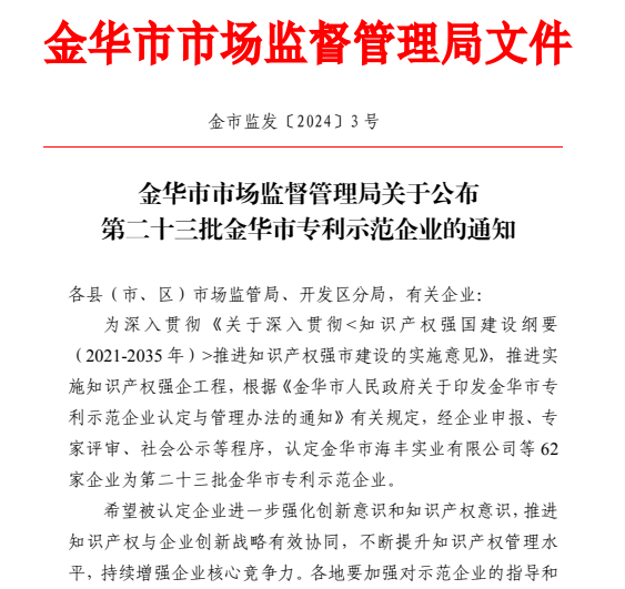 近日,經(jīng)金華市市政府批準(zhǔn),金華市市場(chǎng)監(jiān)督管理局公布了2023年金華市專利示范企業(yè)認(rèn)定結(jié)果,綜合考量企業(yè)知識(shí)產(chǎn)權(quán)創(chuàng)造質(zhì)量、運(yùn)用效益、保護(hù)效果和管理效能,我司 “浙江杭機(jī)股份有限公司”入選金華市專利示范企業(yè)。