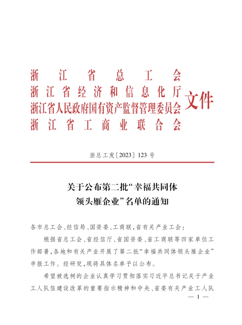 近日,根據(jù)省總工會、省經(jīng)信廳、省國資委、省工商聯(lián)等四家單位工作部署,各地和有關(guān)產(chǎn)業(yè)開展了第二批“幸福共同體 領(lǐng)頭雁企業(yè)”申報工作。我司 “浙江杭機(jī)股份有限公司”入選“幸福共同體 領(lǐng)頭雁企業(yè)”。